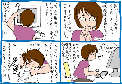 面白めのネタは時々あれど、なかなか更新できませぬ。ちゅうわけで今回は4コマ漫画。ペーパーからの流用でえす。この春から、メルマガの抽選で当選して、ジュエリースクールに半年間ただでワックス鋳造を習いに行けることになりました。んで、すご〜く前から買ってあった、アートクレイシルバーキットに入っていたいろいろの機材を使って、家でもシルバーワークをやってみようと。
