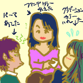 なんて.言い訳ですが.セツ友達のサトさんがある日パーマをあてているのに気付きました.私は気が効いてるつもりで,「あ!パーマあてたんですね!」とチェックしたらば,「...うん,一か月前にねえ」.ああーーゴメンなさい.その数日後,めちゃ久しぶりにヨリちゃんが学校に出て来たんですが,いつもより顔が白かったんで,何気なく「ファンデーション変えた?」って聞きました.わーよくわかるねーー嬉しそうにするヨリちゃんの影から,なにやらじとーーとしたオーラを感じ,ふと振り向くと...サトさんのおクチがトリさんのようにとがっておりました.普通さあ,ファンデーションよりはパーマの方が気が付くよねえ.ええ,おっしゃるとおりでございまするる.
